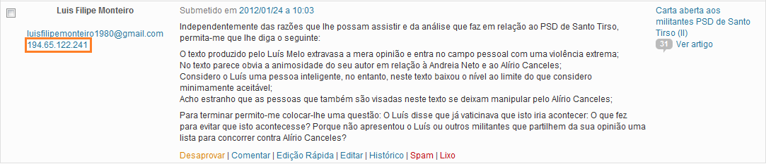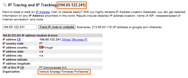 A plataforma do WordPress, onde está alojado este blogue, permite-nos ver o IP de quem comenta. O IP deste senhor era 194.65.122.241. Fui fazer o track ao IP e constatei que estava registado em nome do Instituto Emprego Formação Profissional.