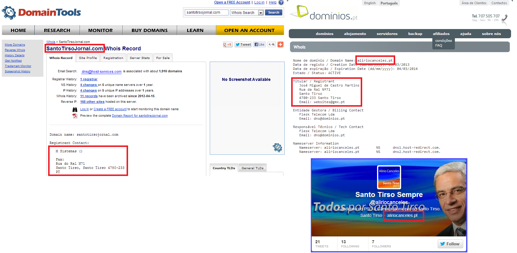 Pois. A verdade está nas imagens que acompanham este post. Tanto o site do Santo Tirso Jornal como o site de campanha de Alírio Canceles, estão registados sobre a mesma morada, que aparentemente é do Miguel Martins. Está portanto justificado e desmascarado o embuste.