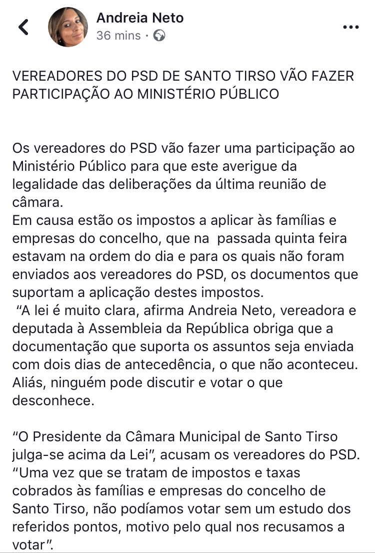 Os vereadores do PSD, liderados por Andreia Neto, decidiram fazer queixa ao Ministério Público – como se pode ver na imagem acima, que mostra uma publicação no Facebook da deputada. Independentemente da razão que possam ter, em relação a uma eventual falta no procedimento, isto é absolutamente descabido e desmesurado.