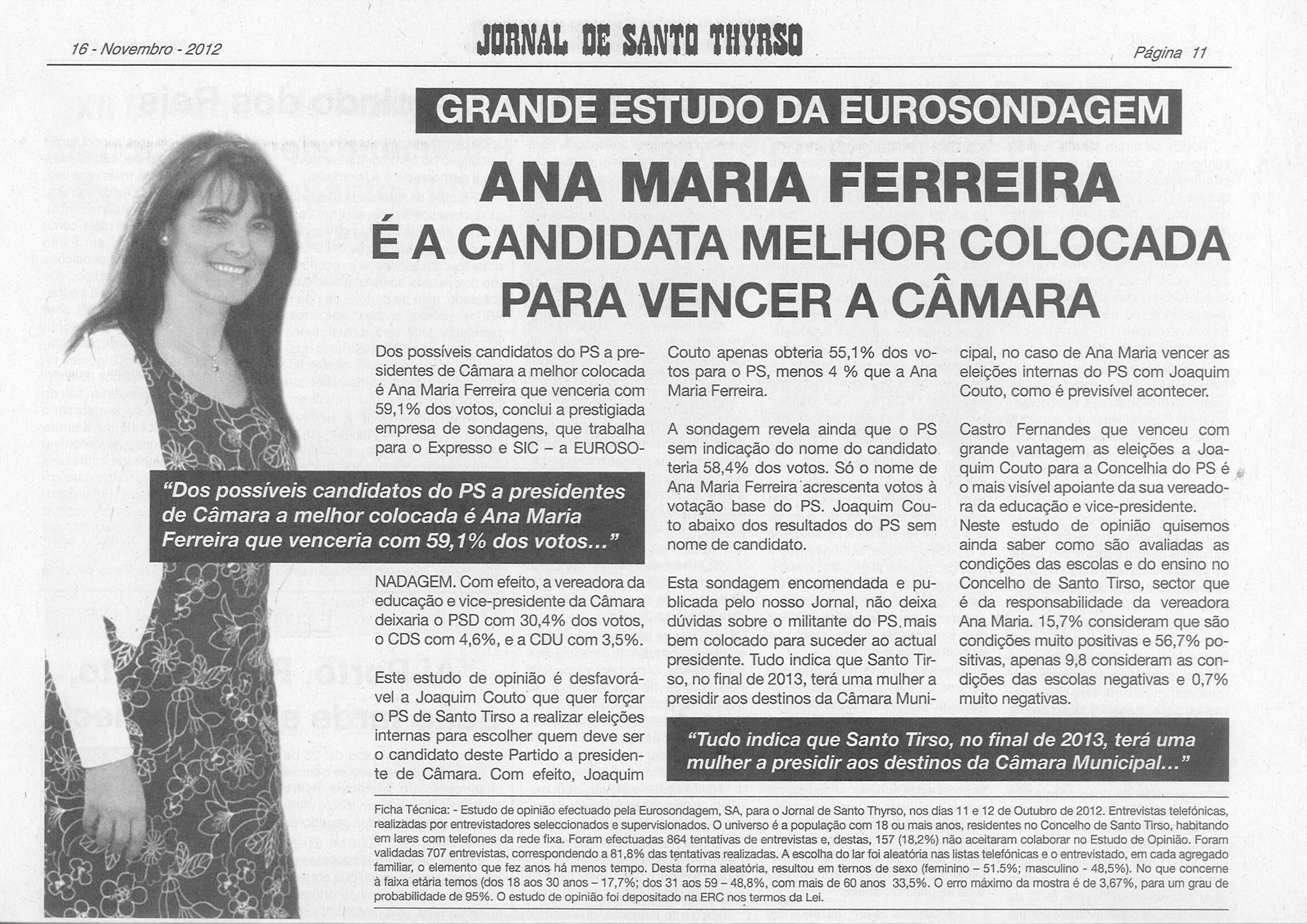 Também na sua página do Facebook, Ana Maria Ferreira publica um (mais do que parcial) artigo do Jornal de Santo Thyrso (ao qual muitos chamam, quiçá com razão, boletim camarário) que pretende demonstrar que ela esta mais bem colocada do que Joaquim Couto.