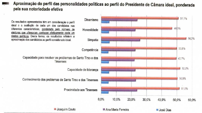 Partilho hoje os resultados da sondagem pedida pela Distrital do PS Porto, e feita pela empresa DOMP, que tinha como objectivo medir a aceitação de 3 hipotéticos candidatos à CM Santo Tirso: Joaquim Couto, Ana Maria Ferreira e José Dias.